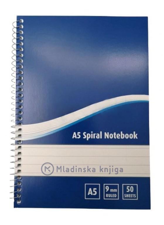 Kolegij blok velikosti A5, s špiralo levo, 50 listni, črtani listi iz 70 gr. papirja. Pakirano po 100 kos v kartonu.