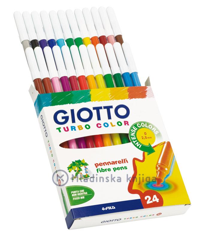 Flomastri Giotto turbo pralni imajo konico iz vlaknin. Dolgotrajna in odporna konica ima premer 2,8 mm. Flomastri imajo zračen pokrovček. barvilo je na osnovi vode, s kože je pralen z milom in vodo, obleko očistimo v pralnem stroju na 40°. Flomastri so pakirani po 24 različnih barv.